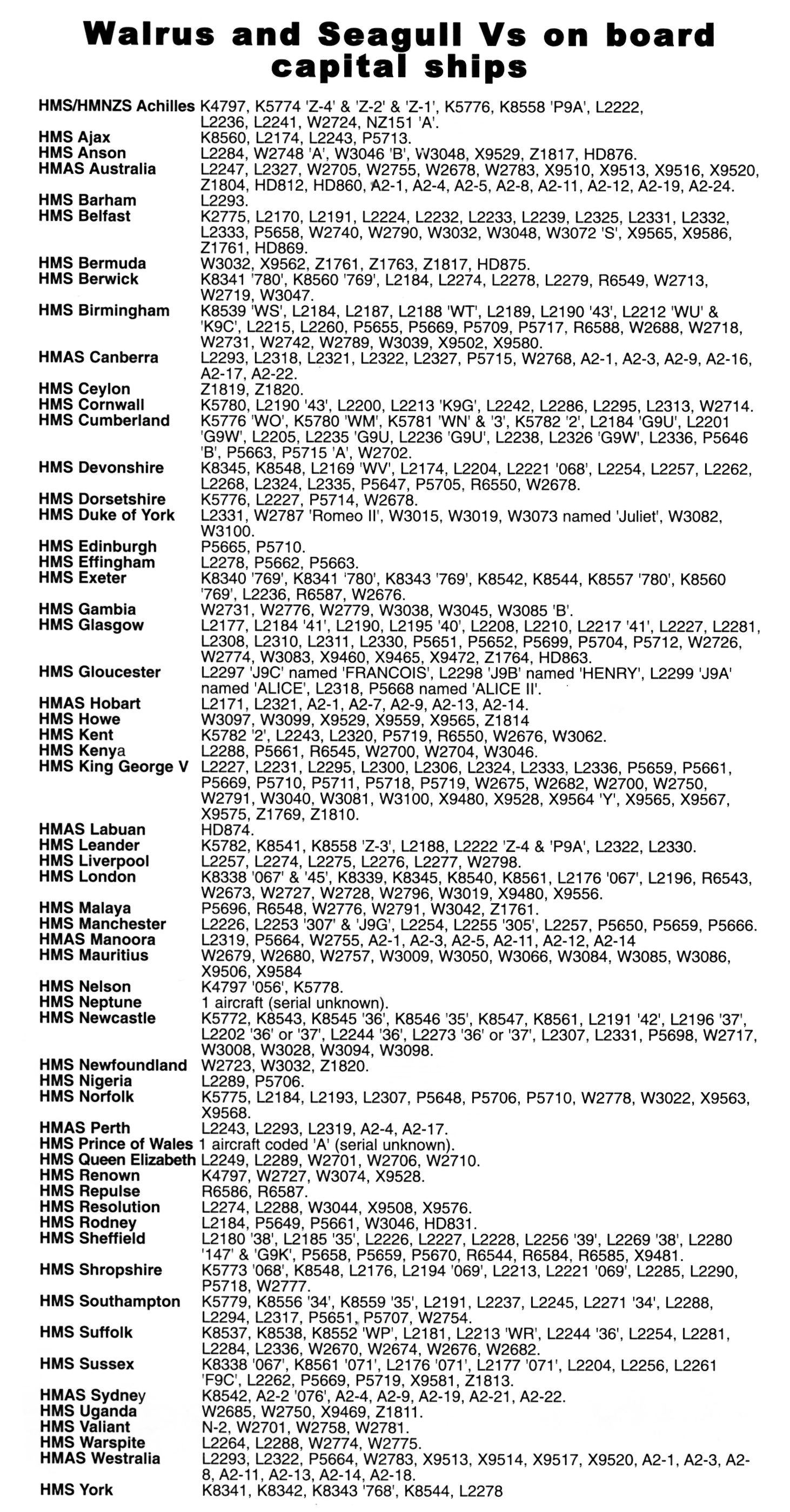 Data Walrus serial numbers and aircraft codes assigned to the Royal Navy capital ships 0A
