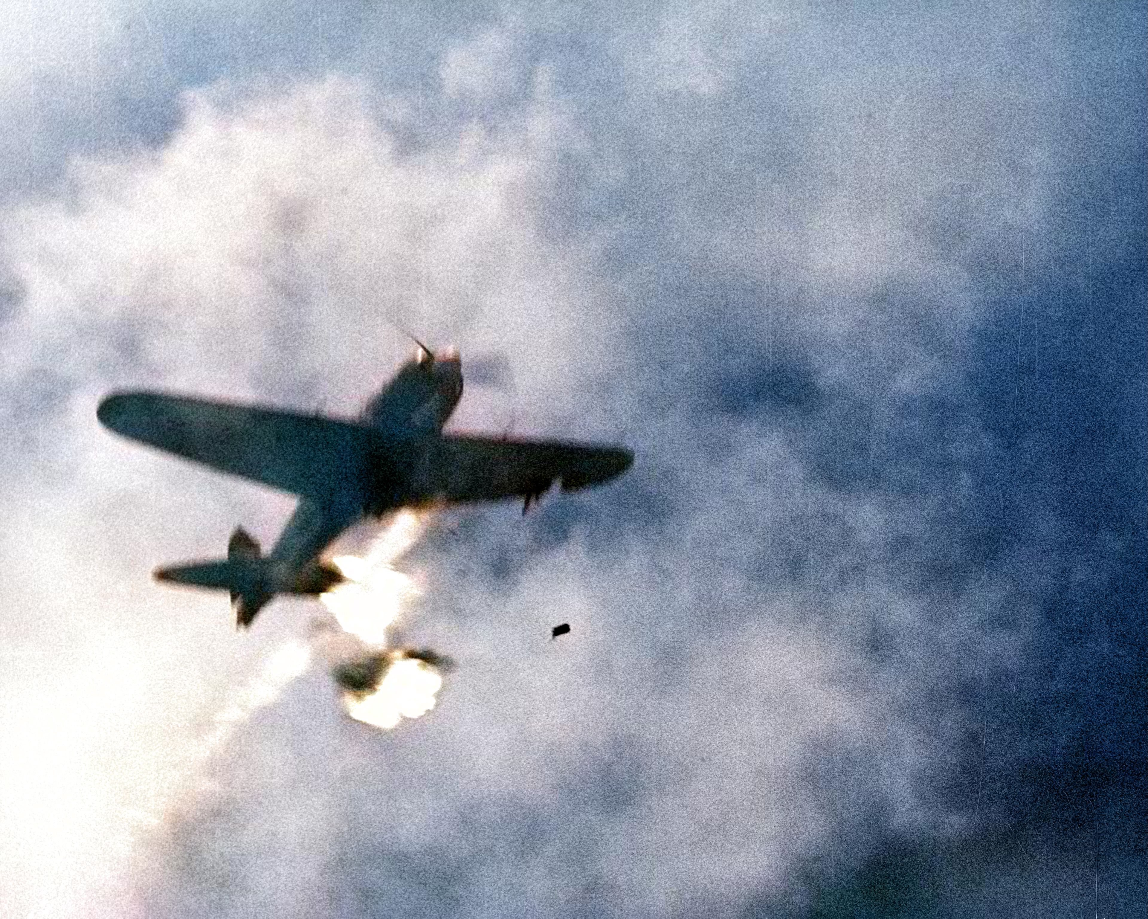 Japanese Zero Kamikaze just before crash diving onto the flight deck of USS Intrepid (CV 11) 25th Nov 1944-NH 62604