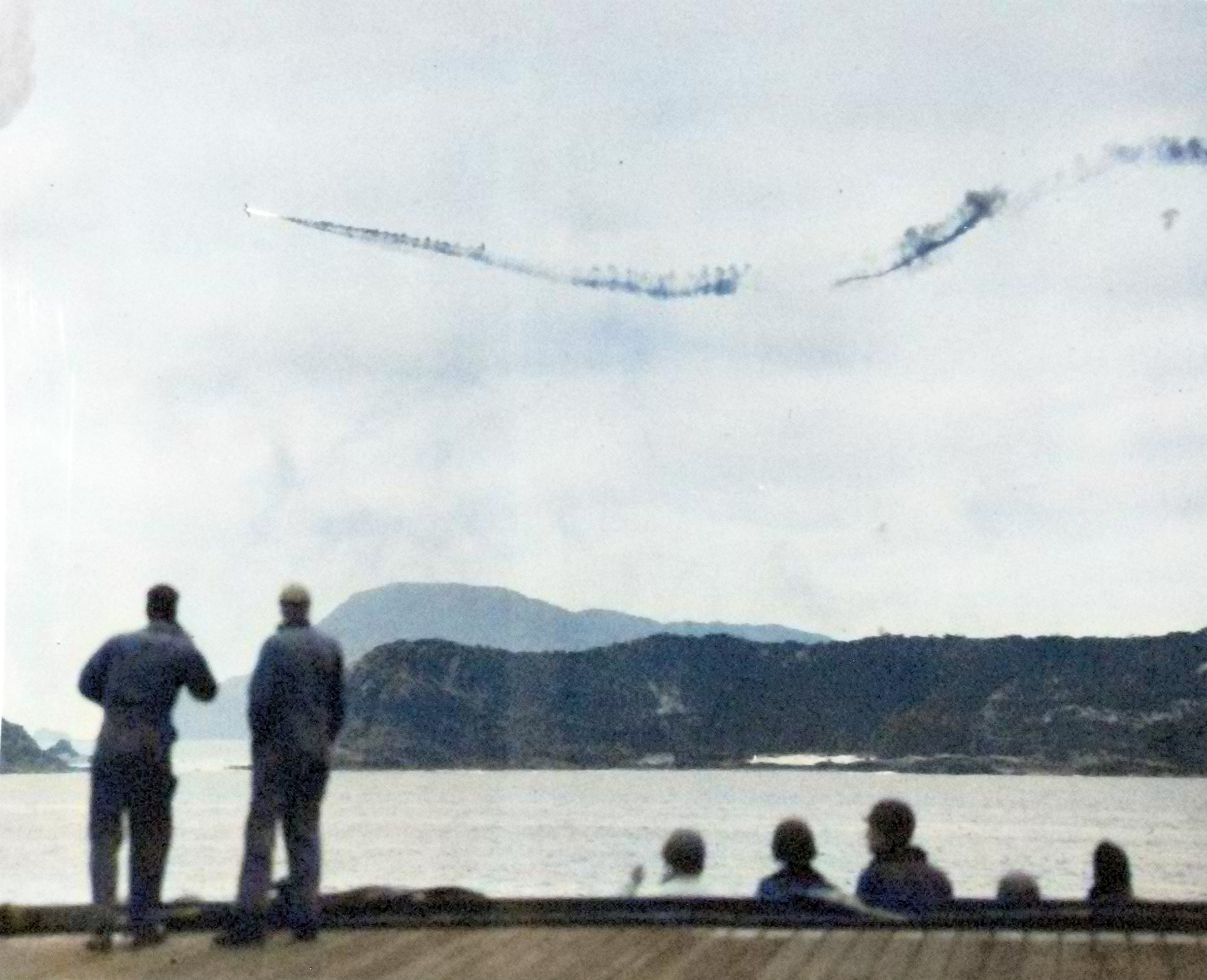 Japanese kamikaze shot down while attempting to attack USS Wake Island (CVE 65) off Okinawa 16th April 1945-80 G 339259