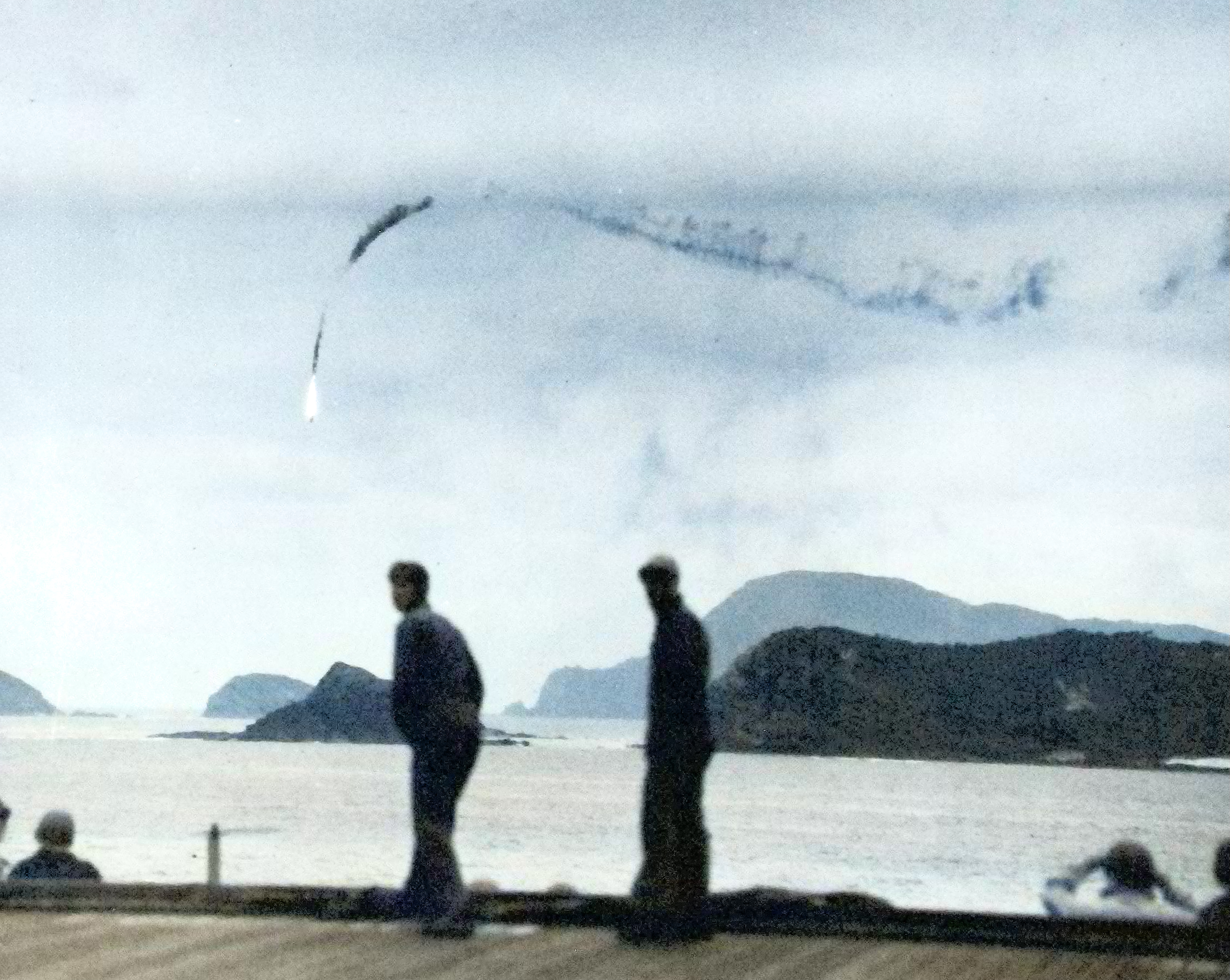 Japanese kamikaze shot down while attempting to attack USS Wake Island (CVE 65) off Okinawa 16th April 1945-80 G 339260