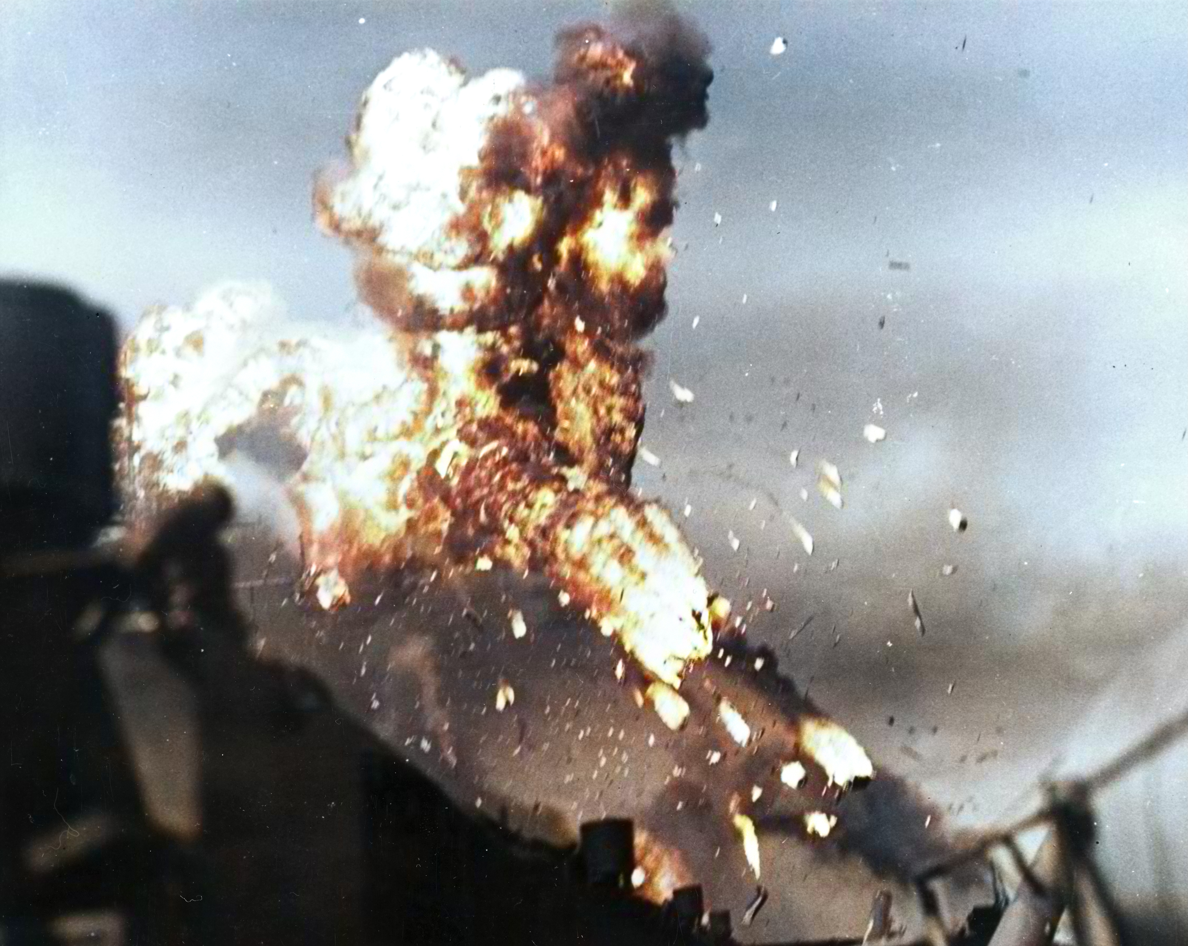 Japanese kamikaze with flaming gasoline fumes disintegrates over USS Intrepid (CV 11) 25th Nov 1944-NH 58029