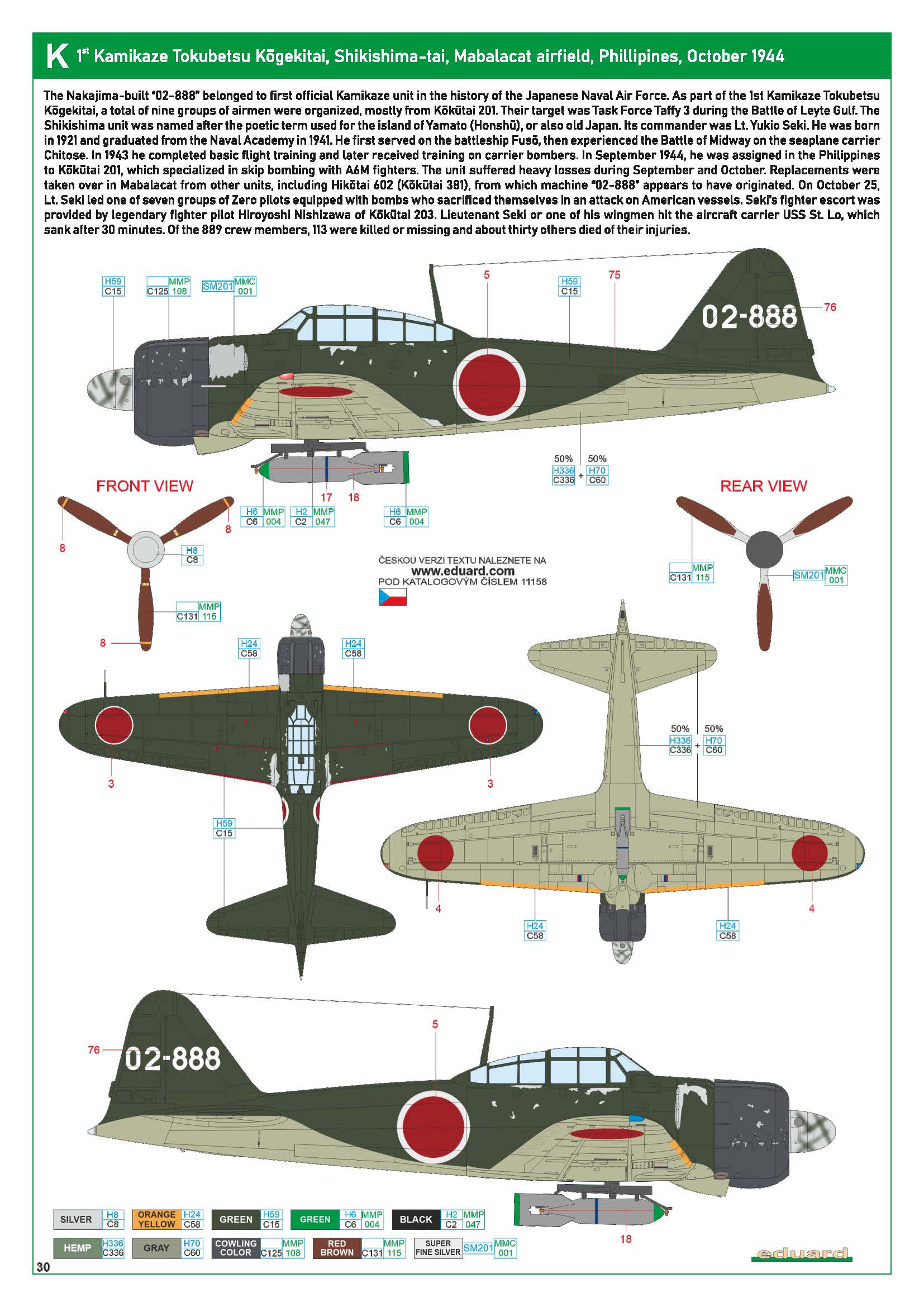 Mitsubishi A6M3 21 Zero JNAF 1st Kamikaze Tokubetsu Kogekitai Shikishima tai 02 888 based at Mabalacat Philippines Oct 1944-0B