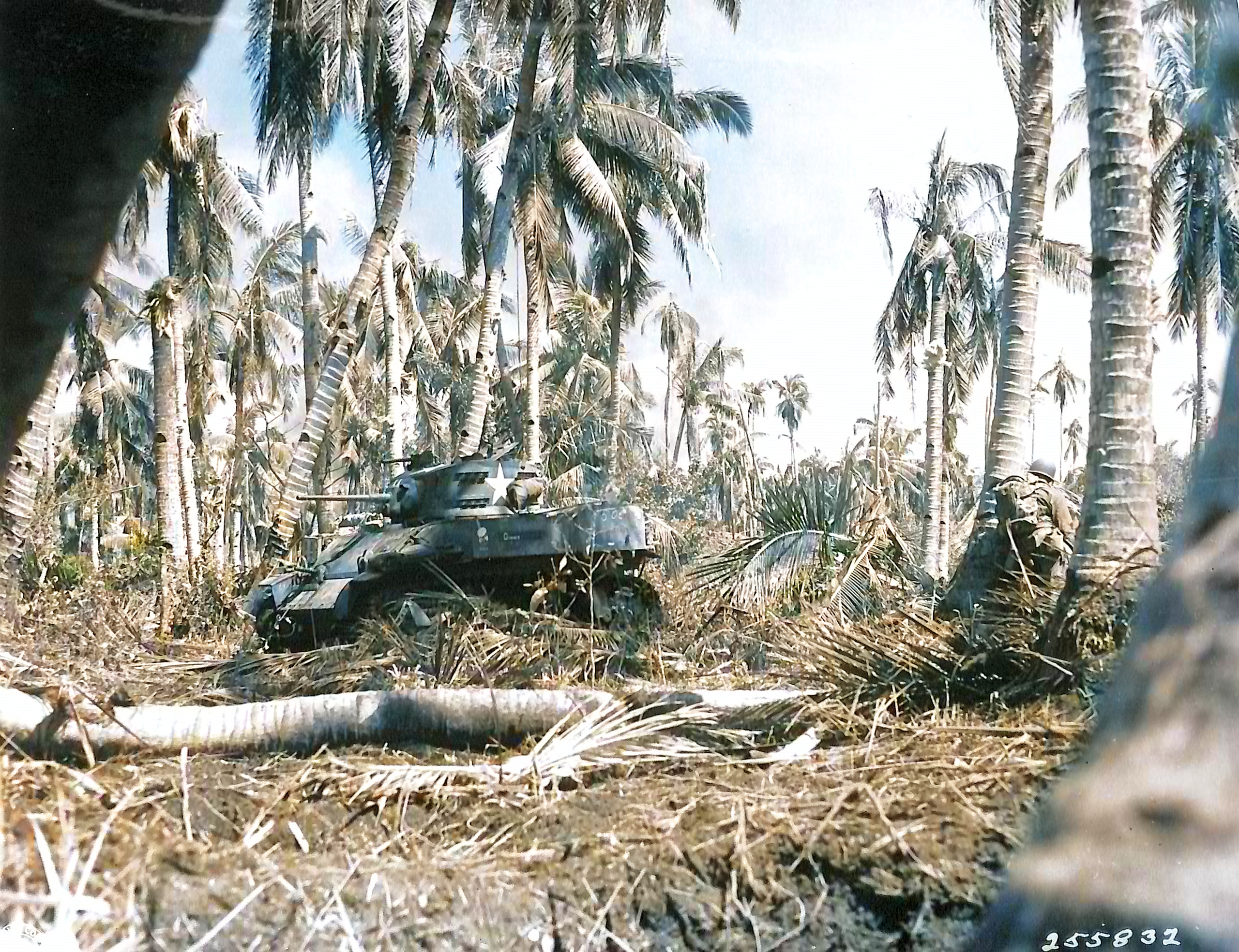 US 44th Tank Battalion with 7th Regiment 2nd Battalion move up on Jap positions on Leyte Island Philippines 20th Oct 1944-01