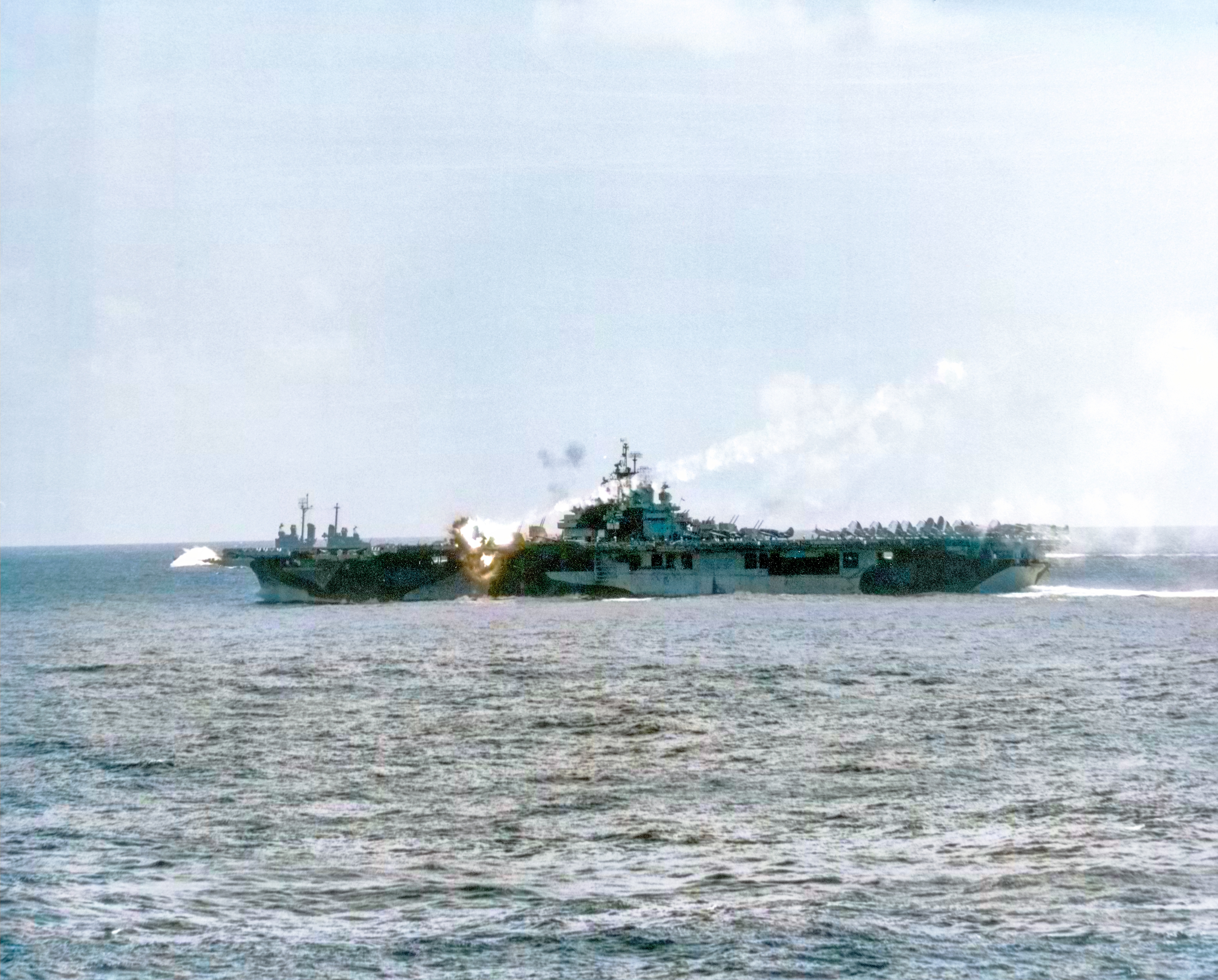 USS Essex (CV 9) being hit by a Japanese Judy during Kamikaze attacks off Luzon 25th Nov 1944-UA47812
