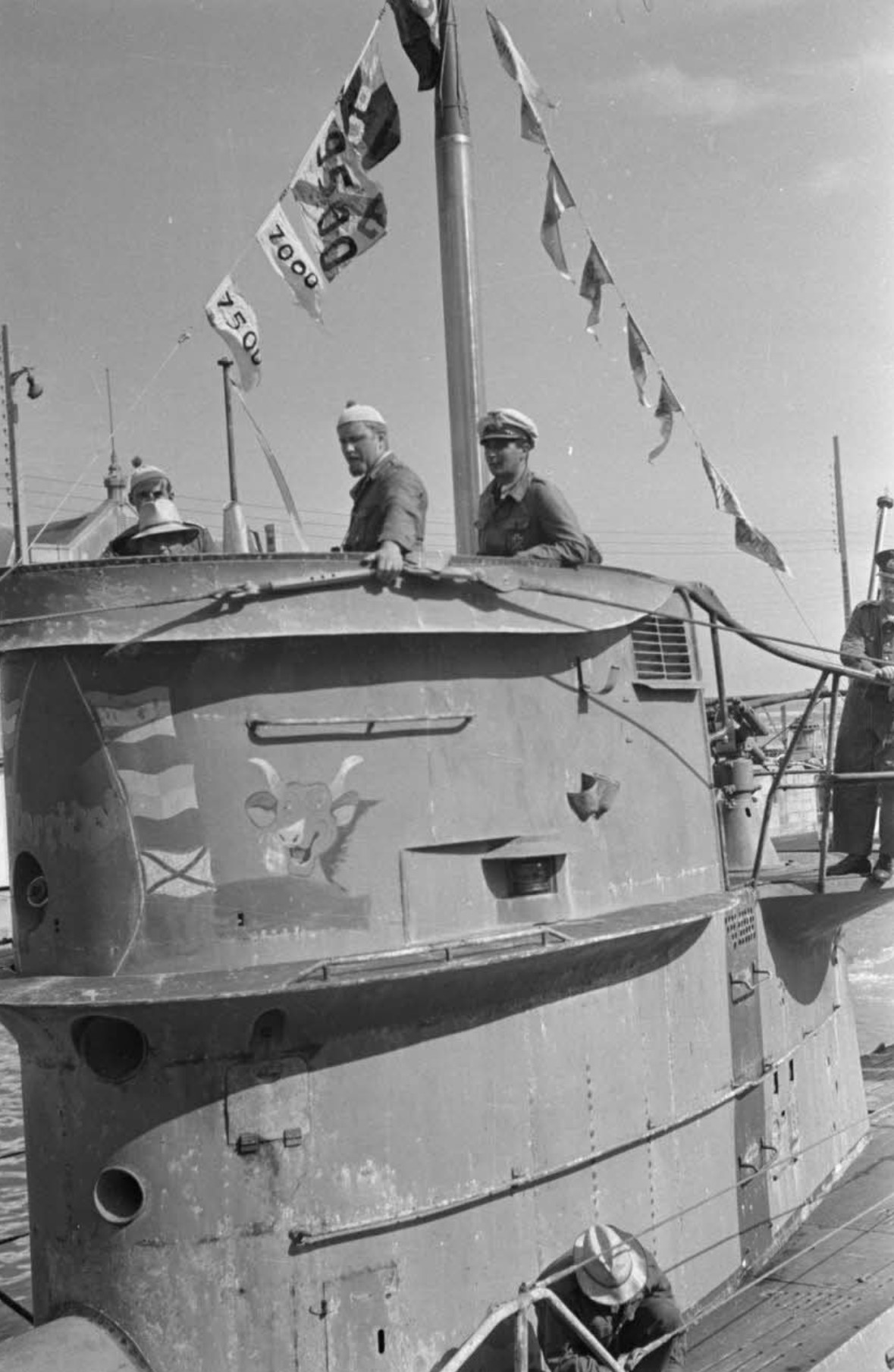 German U boat submarine U 69 insignia (a laughing cow) returns to Saint Nazaire with Commander Jost Metzler 8th July 1941-04