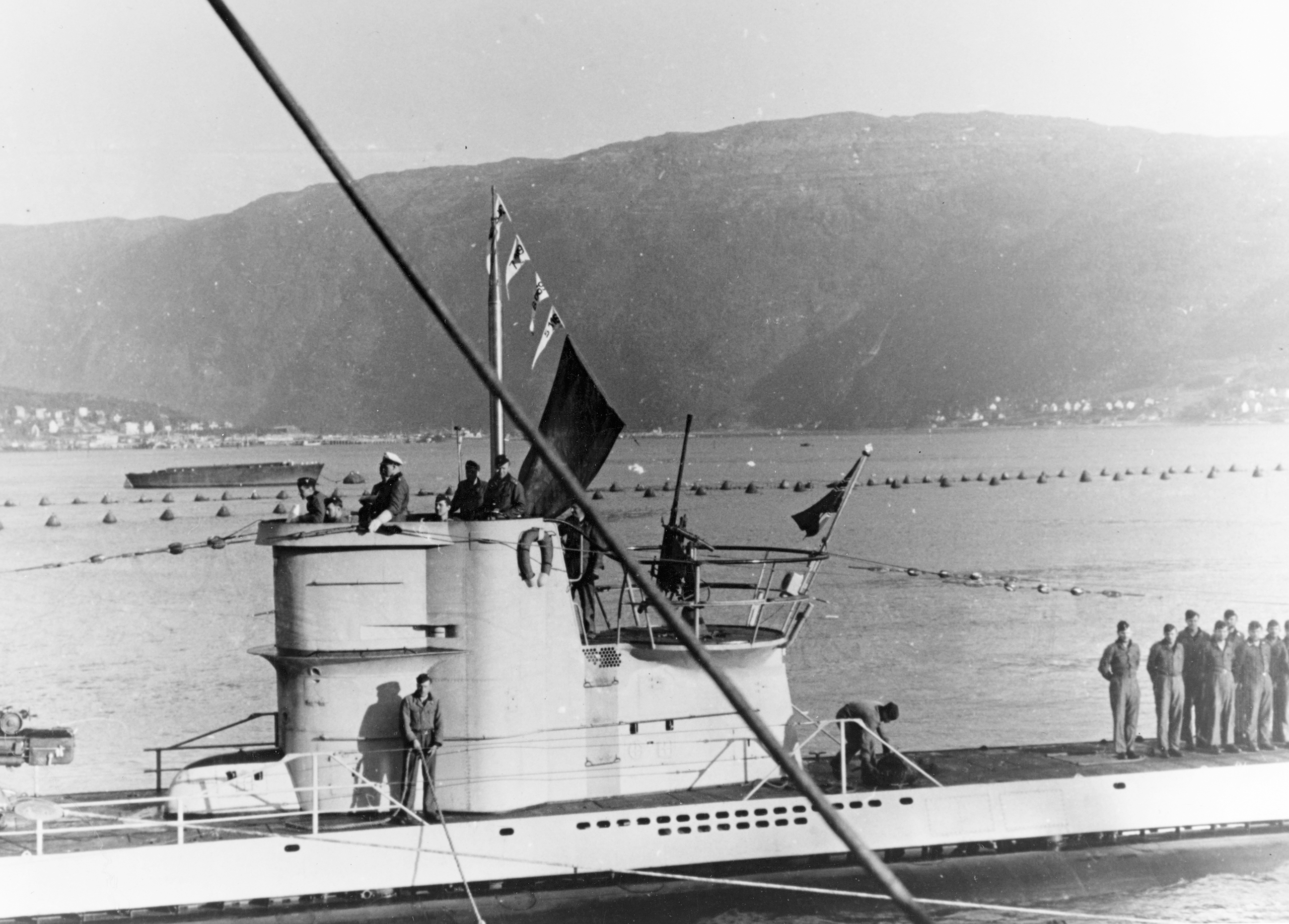 German U boat submarine crews at Narvik Norway flying the flag of one of their victims from Convoy PQ 17 30,000 tons sunk NH 71317