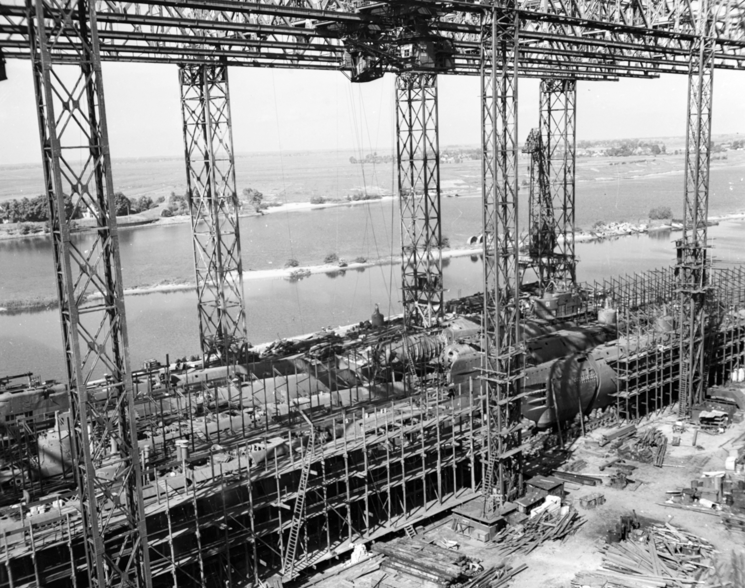 German U boat type XXI submarines captured incomplete on the building ways at Bremen Germany in May 1945-80 G 333675