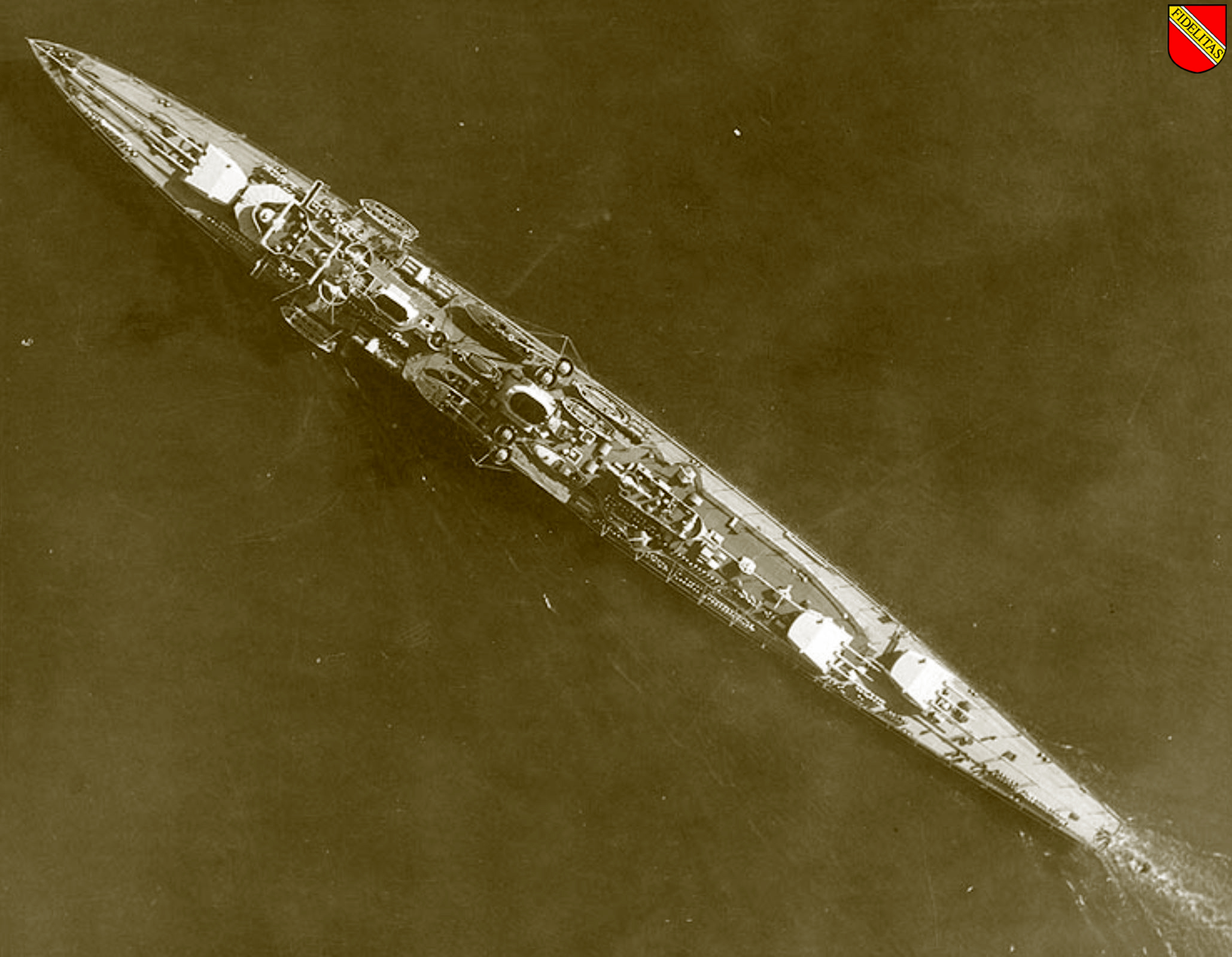 Overhead photo of Karlsruhe showing the offset arrangement of the rear main guns