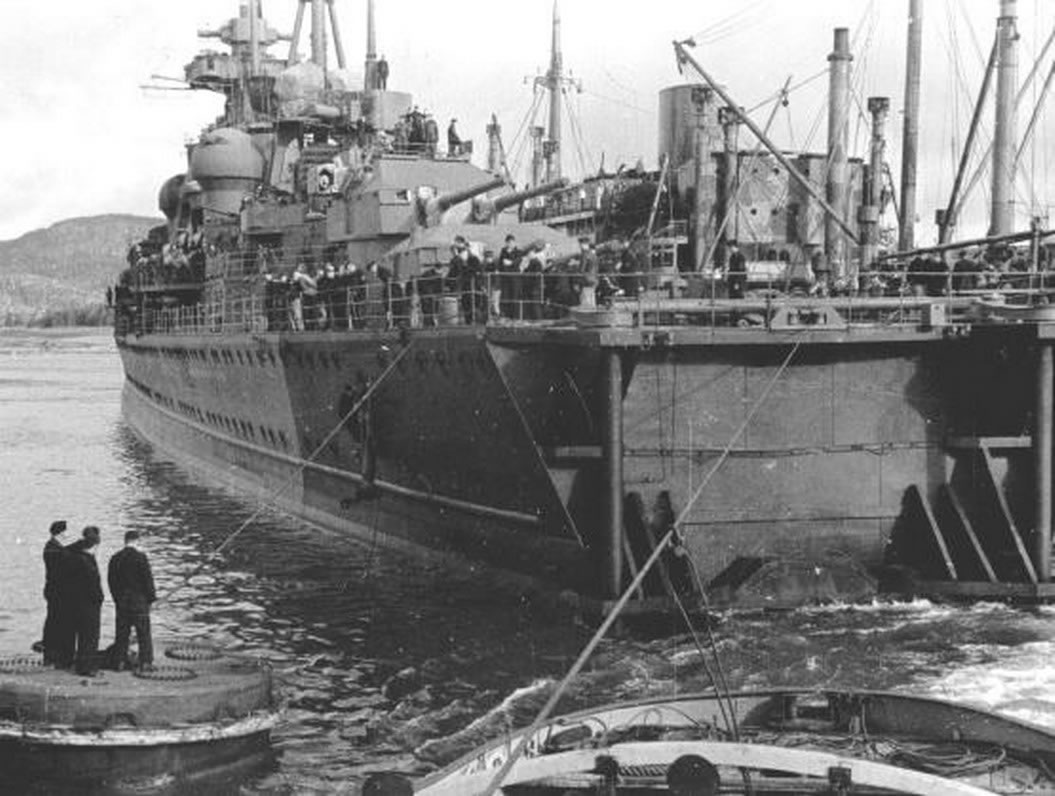 Kriegsmarine Cruiser KMS Prinz Eugen Moored alongside repair vessel Huscaran 01
