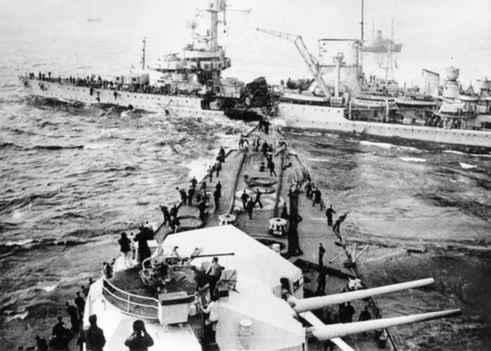In 1941 one of the four modern German battleships, Bismarck sank HMS Hood while breaking out into the Atlantic for commerce raiding. Bismarck was in turn hunted down by much superior British forces after being crippled by an air-launched torpedo. She was subsequently scuttled after being rendered a burning wreck by two British battleships.