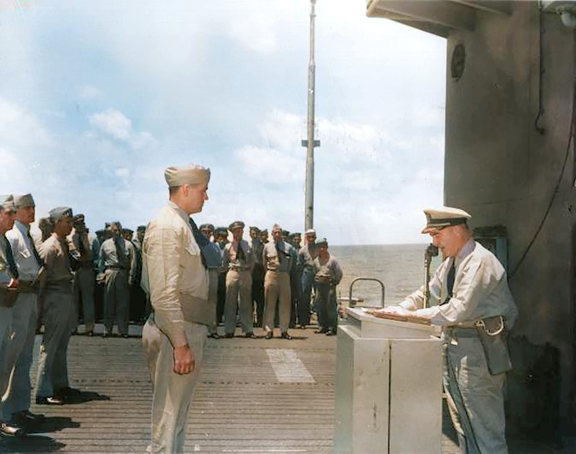The U.S. Navy grew tremendously as the United States was faced with a two-front war on the seas. It achieved notable acclaim in the Pacific Theater, where it was instrumental to the Americans' successful 'island hopping' campaign.[4] The U.S. Navy fought six great battles with the Imperial Japanese Navy (IJN): the Attack on Pearl Harbor, Battle of the Coral Sea, the Battle of Midway, the Battle of the Philippine Sea, the Battle of Leyte Gulf, and the Battle of Okinawa. By war's end in 1945, the United States Navy had added nearly 1,200 major combatant ships, including ninety-nine aircraft carriers, eight 'fast' battleships, and ten prewar 'old' battleships totaling over 70% of the world's total numbers and total tonnage of naval vessels of 1,000 tons or greater.